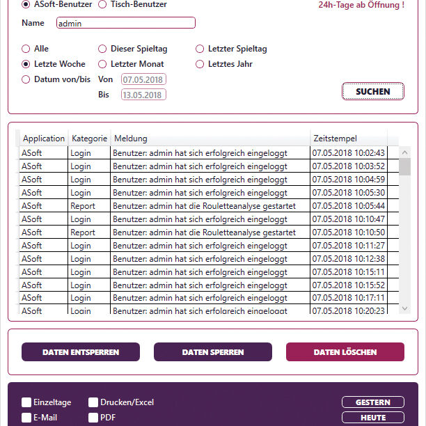 Mit „PEye ASoft“ können zahlreiche Auswertungen zu Spielgeräten und Personal durchgeführt werden.