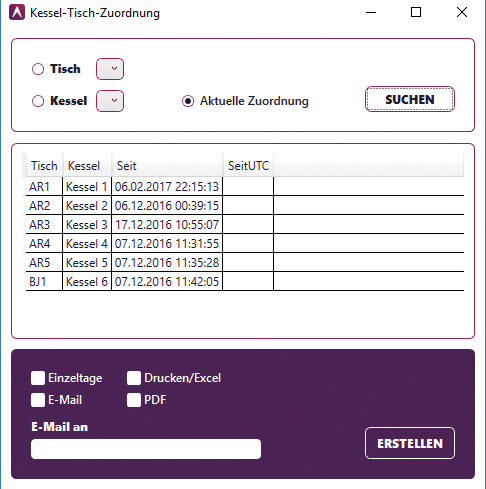 Mit dem Bericht „Tisch-Alarme“ können Sie sich zu allen vorausgegangenen Ereignissen, wie beispielsweise einem Rotortausch, der Betätigung von Tür- und Schließkontakten am Tischunterschrank mit dem Tisch-PC und der Jeton-Sortiermaschine sowie zu Stromausfällen im System, Berichte erstellen lassen.