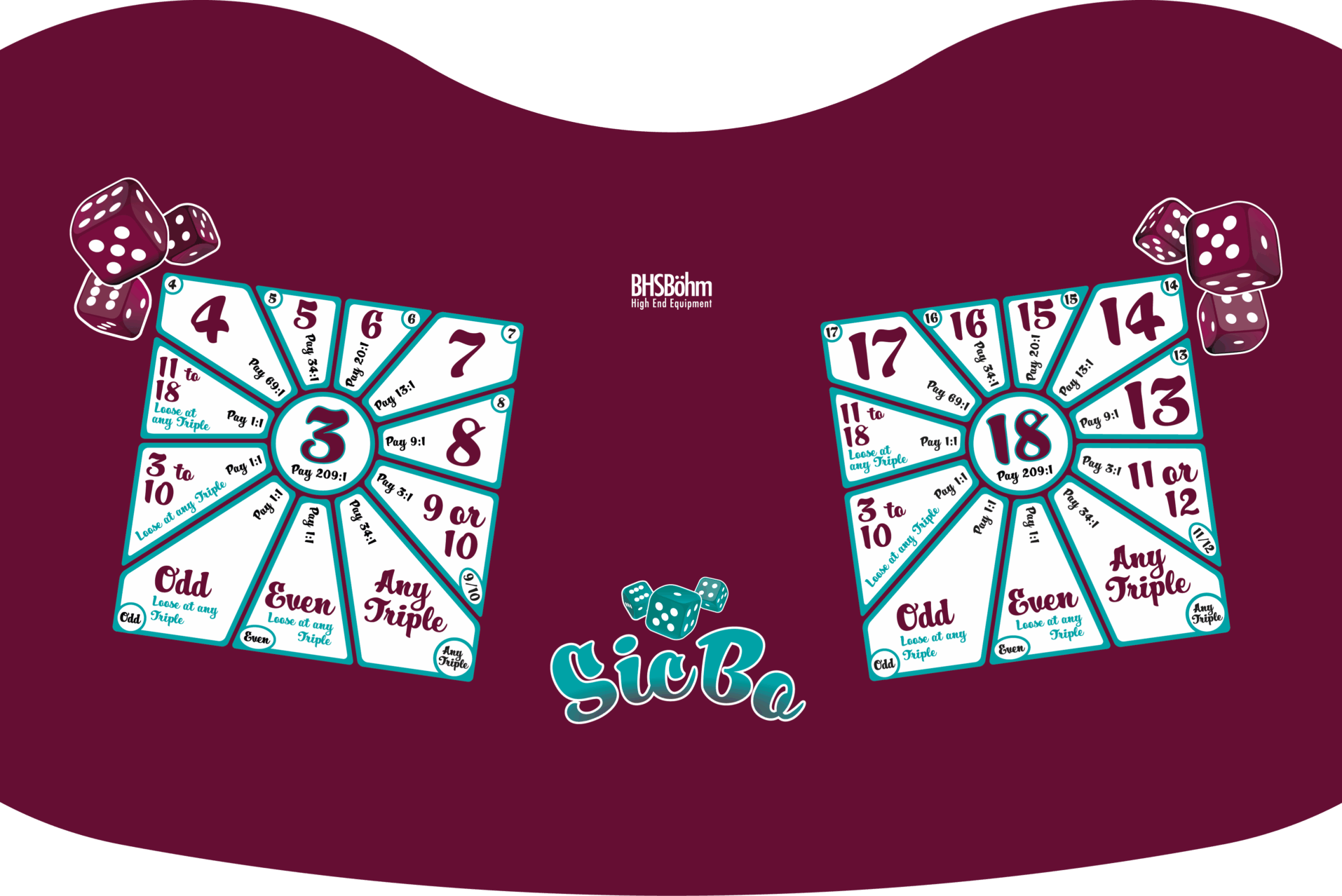 Es kommen drei Würfel zum Einsatz, die zusammen Zahlenkombinationen von 1 bis 18 ergeben. Die Würfel verfügen über Punkte und Ziffern als Markierung. Die Ziffernkombinationen ergeben dann die „One“ und „Two“, die sonst beim klassischen Sic Bo fehlen. Dadurch gleichen wir die Auszahlungsquoten an das Roulette an und bringen auch die Gewinnchancen des Roulette auf dem Tableau unter.