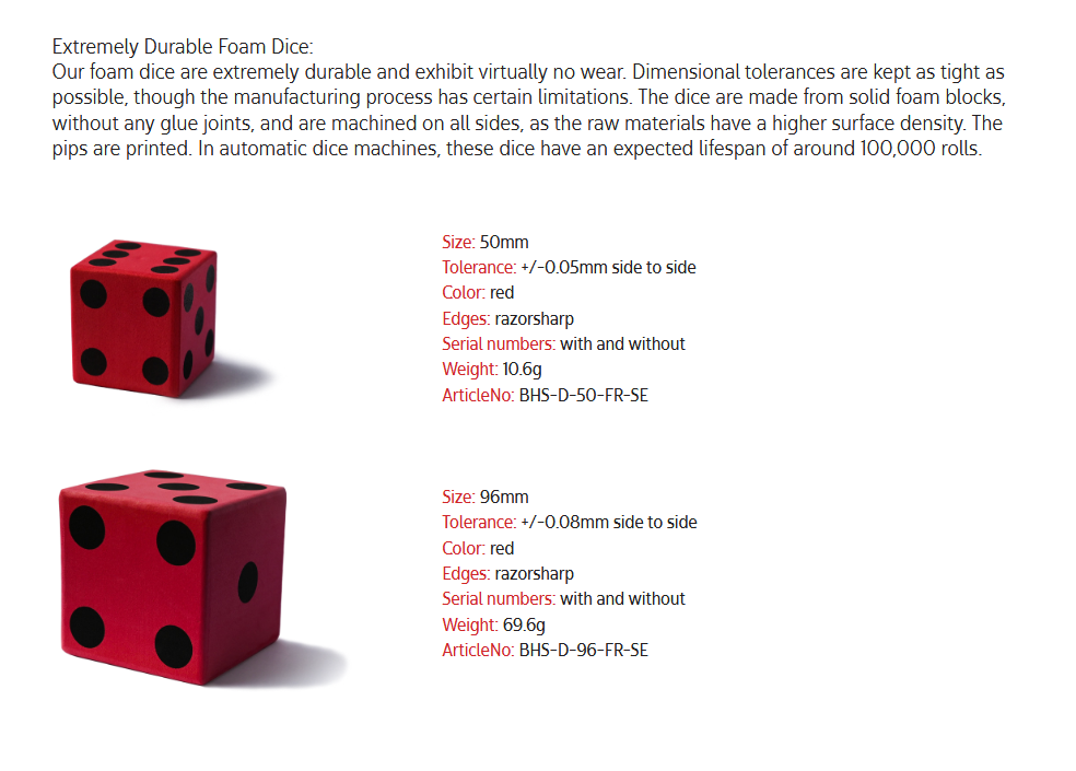 Mit minimalen Maßtoleranzen zwischen den drei Dimensionen gewährleisten wir eine ausgezeichnete statistische Zufallsverteilung. Kleine Würfel bestehen aus Acryl, während größere Würfel aus strapazierfähigem Schaumstoff gefertigt sind. Wir haben besonders auf die Erkennbarkeit durch Kameras geachtet und sorgen für einen optimalen Kontrast zwischen dem Würfelkörper und den Augen.
